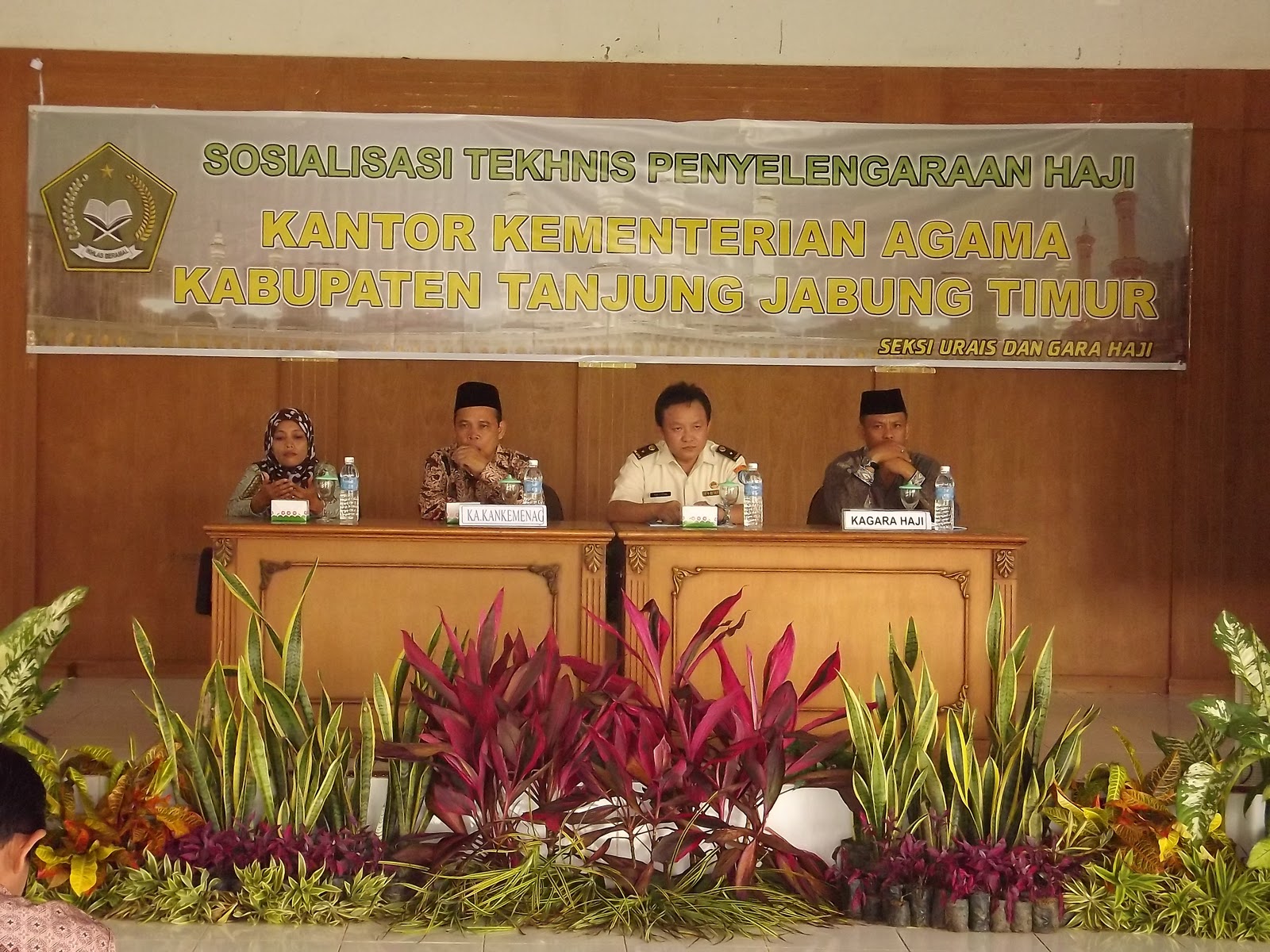 Kepala KanKemenag Tanjung Jabung Timur, H. Syakroni, S.Ag dalam sambutannya mengungkapkan terima kasih kepada seksi urais dan penyelenggaraan haji Kementerian Agama Kabupaten Tanjung Jabung Timur yang telah menyelenggarakan kegiatan ini, mengingat begitu kompleksnya permasalahan yang ada pada penyelenggaraan haji. Setidaknya, kegiatan ini dapat memberikan informasi kepada seluruh peserta tentang seperti apa sebenarnya penyelenggaraan haji. “kita berharap kedepan dimana penyelenggaraan haji ini dapat terus berjalan dengan baik” ujranya.